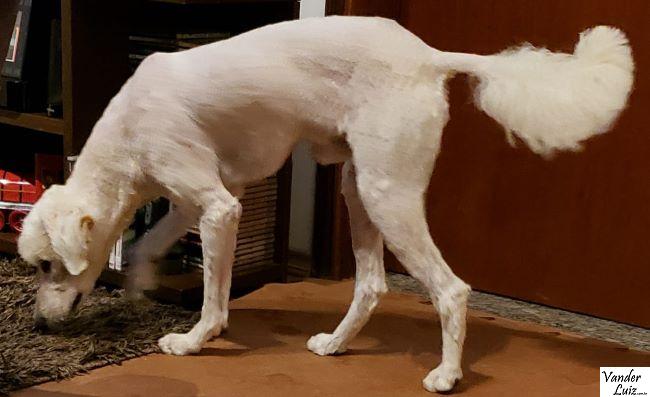 Em meio a chuva deste sábado, um cachorro apareceu na porta de uma casa em um condomínio do Jardim Suíça Paulista (São Roque), próximo ao reservatório de água.