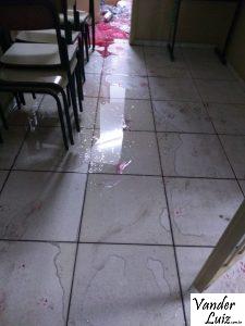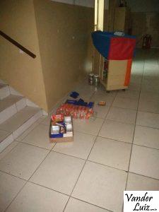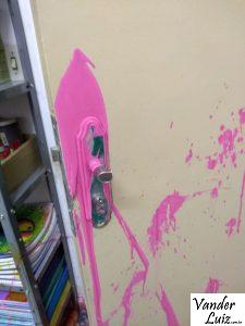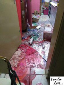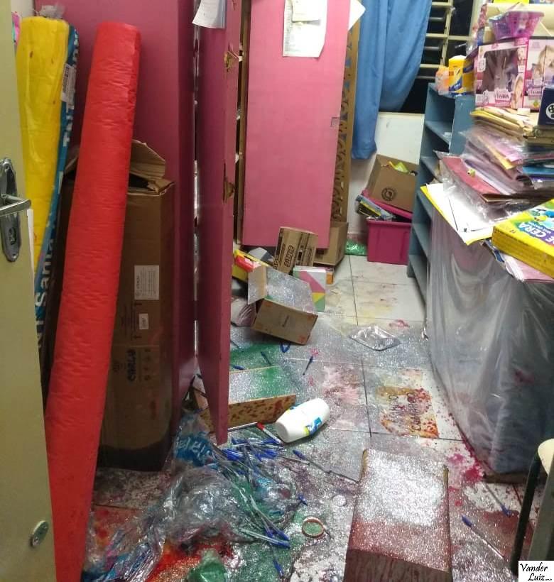 Pelas fotos enviadas à nossa equipe, é possível ver a depredação de materiais, como folhas sulfite, tintas de colorir, massas de modelar, além de outros objetos escolares que foram destruídos. Portas e janelas também foram quebradas durante a invasão.