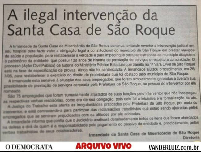 “Embora ainda não tenha sido sentenciado, a Irmandade ajuizou procedimento em 26/07/2005 para restabelecer o exercício do direito de propriedade que foi obstado pelo município de São Roque… São 75 funcionários que foram sumariamente afastados de suas funções… A Justiça do Trabalho está atenta às irregularidades praticadas pela Prefeitura de São Roque, por meio de interventor.”