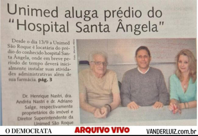 Desde 19 de setembro de 2005, a Unimed São Roque tornou-se locatária do prédio conhecido como Hospital Santa Ângela. Em breve, instalaria ali suas atividades administrativas e também sua farmácia. A publicação saiu na primeira página do Democrata, com a foto do médico Adriano Salge (diretor-superintendente do plano de saúde) e dos proprietários do imóvel, o médico Henrique Nastri e Andréa Nastri.