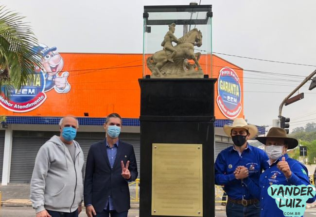 A imagem de São Jorge voltou nesta segunda-feira (16 de agosto) ao obelisco na esquina das avenidas John Kennedy e Tiradantes após ter sido furtada na madrugada de 5 julho e recuperada no dia seguinte em Itaquaquecetuba.