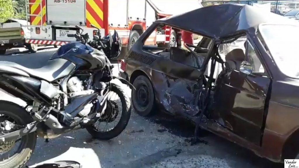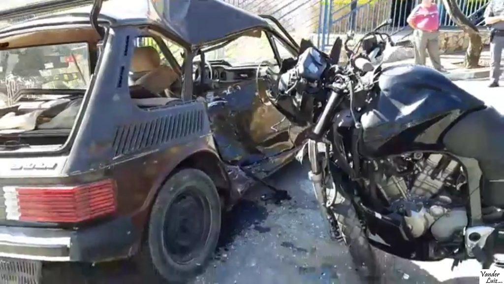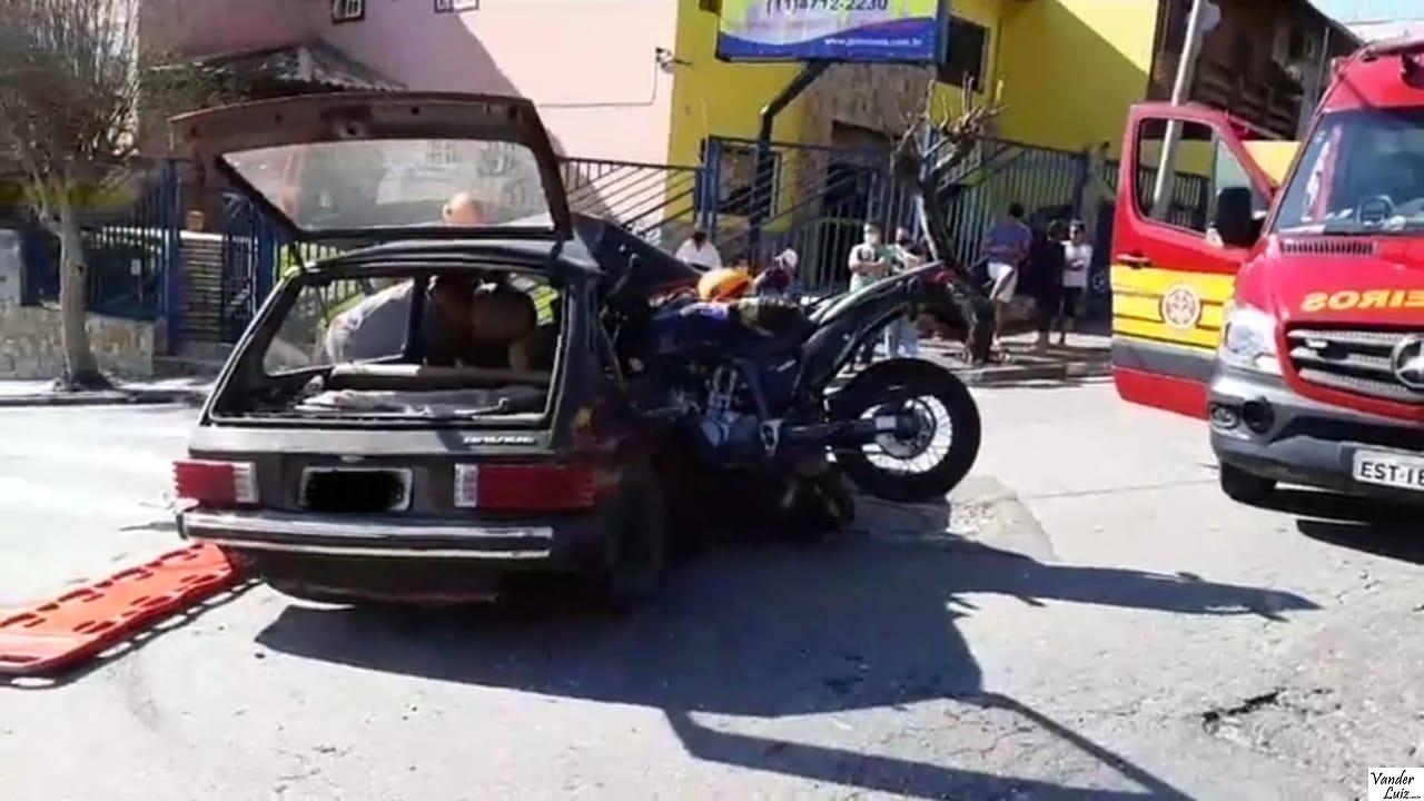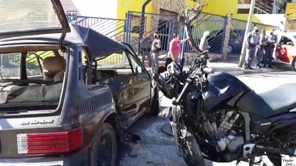 Moto fica “cravada” no carro em acidente na Avenida Varanguera, em São Roque