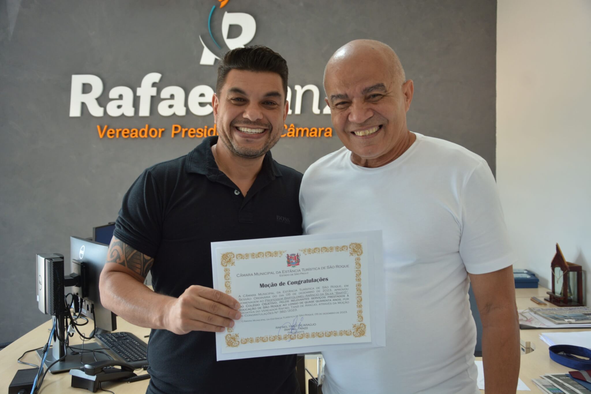 O professor Bartolomeu Amâncio da Silva (Colégio Objetivo), conhecido como Bartô, foi homenageado na tarde da última quinta-feira (14 de dezembro 2023) com a Moção de Congratulações nº 382/2023, entregue pelo presidente da Câmara Municipal, Rafael Tanzi. A solenidade ocorreu na sede do Legislativo e reconheceu os relevantes serviços prestados pelo educador à área da Educação ao longo de quase quatro décadas de atuação.
